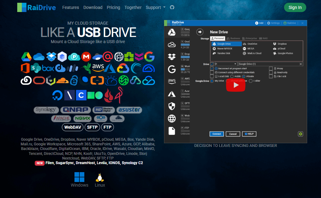 - 다양한 클라우드 스토리지 지원: Google Drive, OneDrive, Dropbox, Amazon S3, Azure Blob Storage, WebDAV, FTP, SFTP 등 다양한 클라우드 스토리지를 지원합니다.